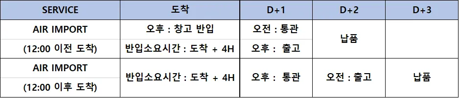 A. 항공의 경우, 일본 도착 시간에 따라서 업무 절차가 상이하며, 하기 표와 같이 오전 / 오후 도착 기준에 따라 진행됩니다.