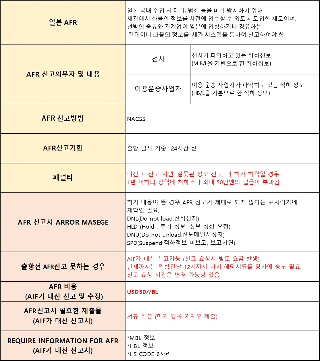 A. 출항 일시 기준 24시간 전에 지정된 시스템을 통해 Origin Forwarder 또는 선사가 사전에 일본 세관에 신고해야 합니다. Advance Filing Rules의 약자로 통칭 출항전보고제도 라고 합니다.