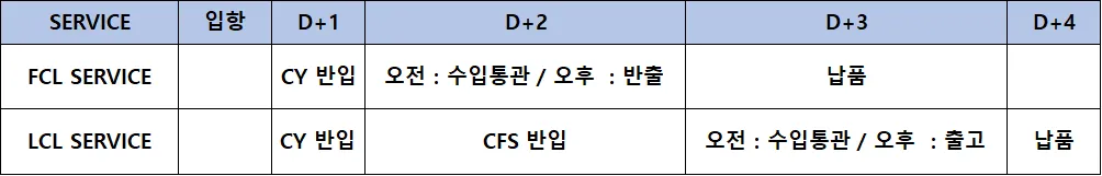 A. 해상의 경우, FCL / LCL에 따라서 업무 절차가 상이하며, 업무 절차는 하기 표와 같습니다. 하기의절차는 기본적인 절차이며, 세관 검사 또는 반입 시간에 따라서 일정이 변경될 수도 있습니다.