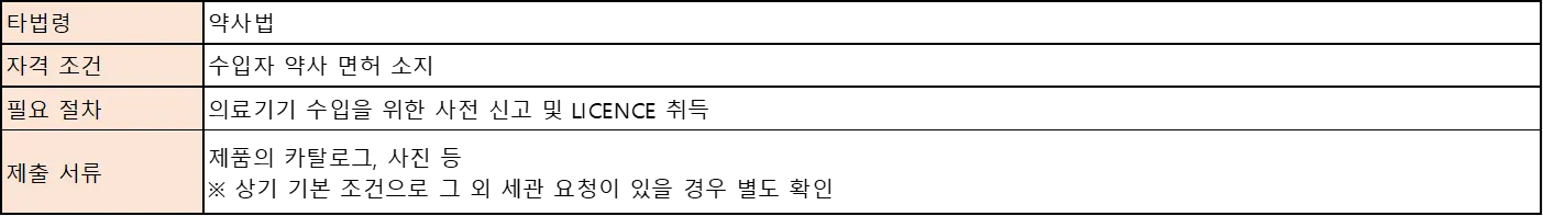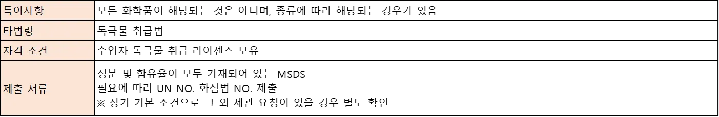A. 주요 품목들에 대한 타법령을 하기와 같이 안내드리오니 참조를 부탁드리겠습니다.