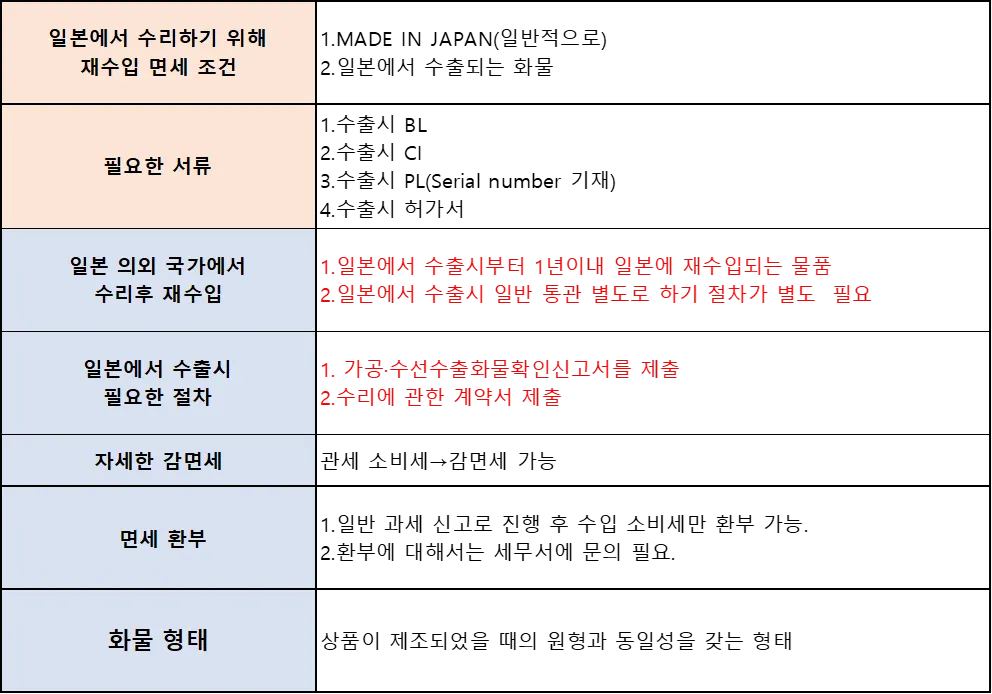 A. 재수입 면세 절차는 하기 표를 참고해 주시기 바랍니다.