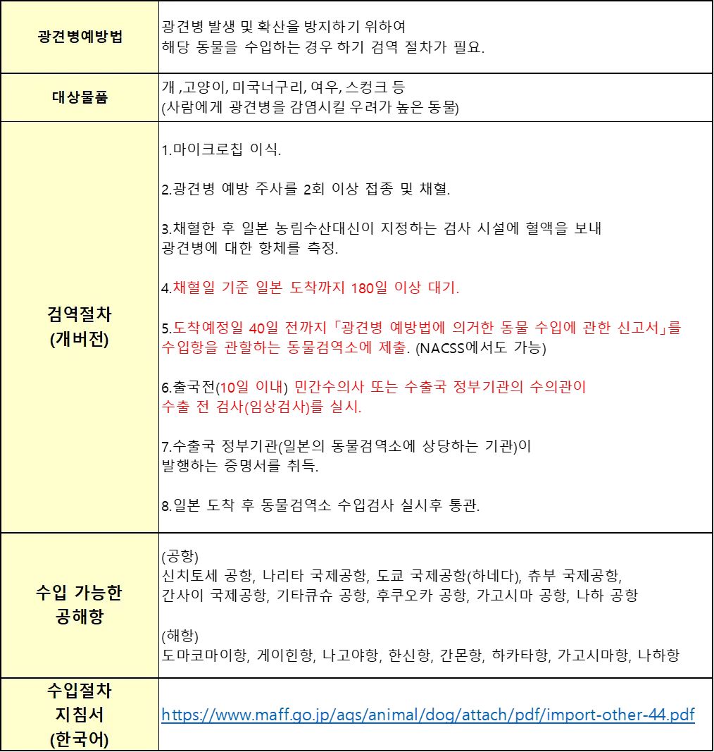 A. 일반적인 애용용 동물(개, 고양이 등)은 광견병 예방법에 적용을 받아 하기 표와 같이 진행됩니다.