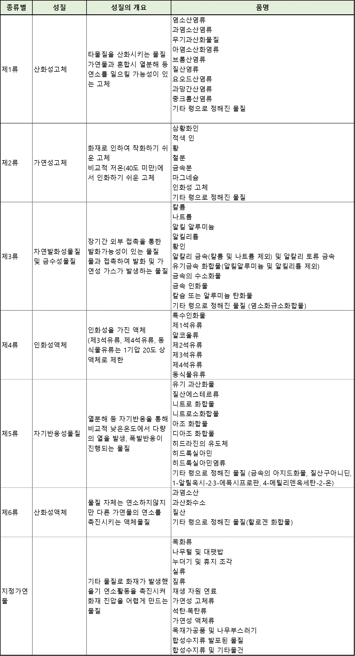 A. 일본 소방법 상 위험물 분류표는 하기와 같습니다.