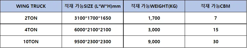 A. 일본은 한국과 다르게 일반 화물트럭이 2 ton / 4 ton / 10 ton 으로 구분되며, 상세 적재 가능 명세는 하기 표와 같습니다.